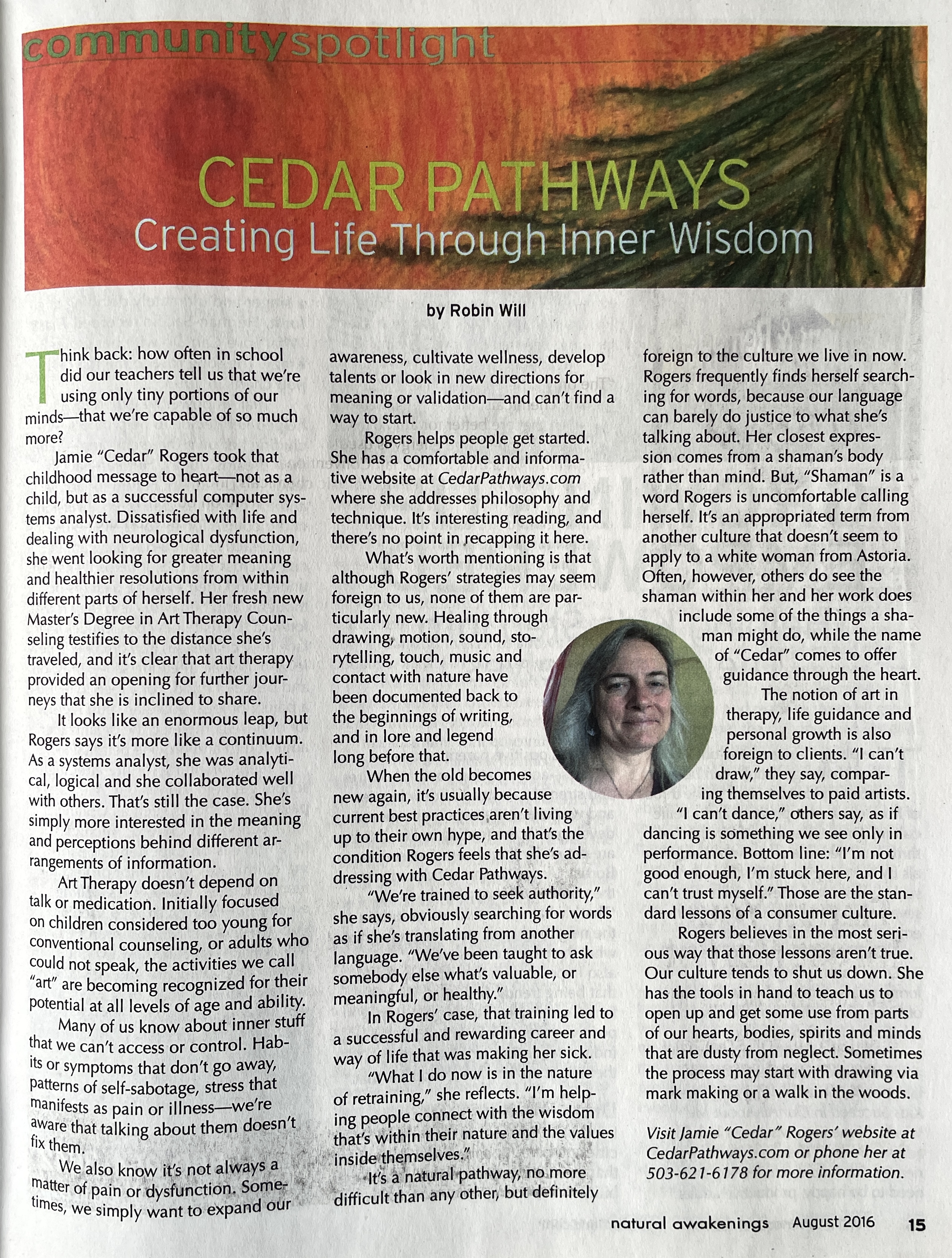 "Cedar is very skilled at guiding one into the deeper self to access inner worlds. I loved the shamanic drawing class I had the opportunity to take and would highly recommend her work" ~ S.A.